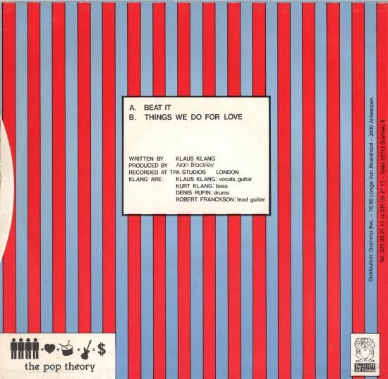ベルジアンパンクバンドX-PULSIONの元ドラマー、KLAUS KLANGによって結成されたニューウェーブ/スカリヴァイヴァルグループ、KLANGの1stシングル。B面に歯切れの良いアップテンポなポップナンバーが収録された貴重な一枚。1980年ベルギーオリジナル盤。