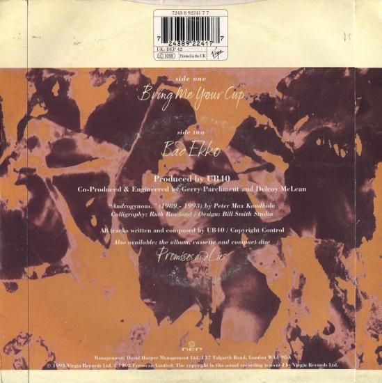 ブリティッシュレゲエグループ、UB40が'93年にリリースした大ヒット10thアルバム、'Promises And Lies'からのシングルカット。穏やかなメロディに癒されるレゲエポップナンバー。1993年UKオリジナル盤(7inch)。